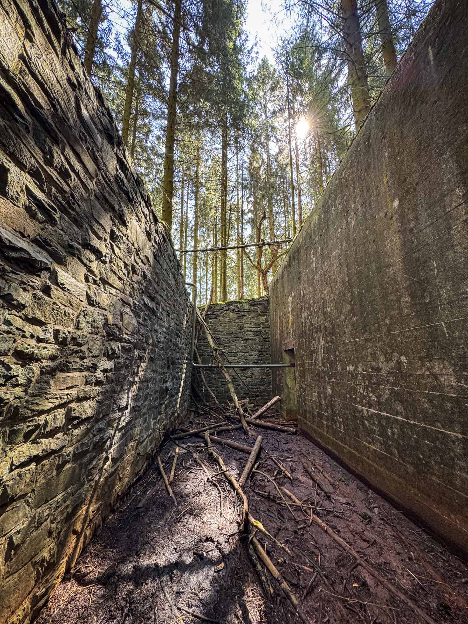 Einer dieser Lost Places befindet sich in Simmerath: der Wasserbunker Jägerhaus, ein unterirdischer Wasserspeicher, der einst die umliegenden Westwall-Stellungen mit Trinkwasser versorgte. Er liegt gut versteckt im Wald und ist bis heute gut erhalten, auch wenn er längst außer Betrieb ist. Von hier aus kann die Wanderung ausgedehnt werden, z. B. zum Entlüftungsschacht Kallstollen oder zur Kalltalsperre mit dem Kaiserfelsen.