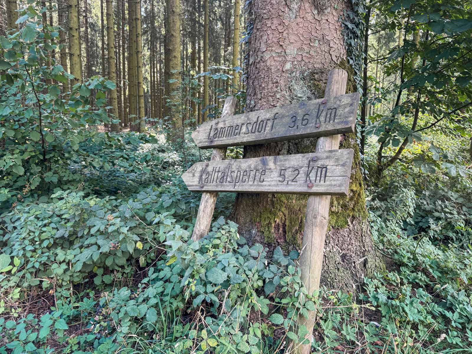Startpunkt ist der Parkplatz „Jägerhausstraße“ (Google Maps). Von dort führt ein breiter Waldweg in Richtung Kalltalsperre, auf dem man unübersehbar auf ein Windrad zusteuert.