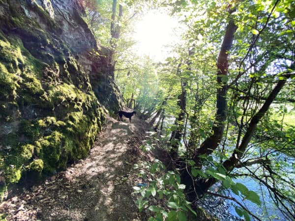 Dies ist ein ganz besonders schöner Spaziergang, der eine ganze Menge Abwechslung bietet: schattige, schmale Wege am Fluss, eine Hühnerfarm, die Archäologiewerkstatt Gut...